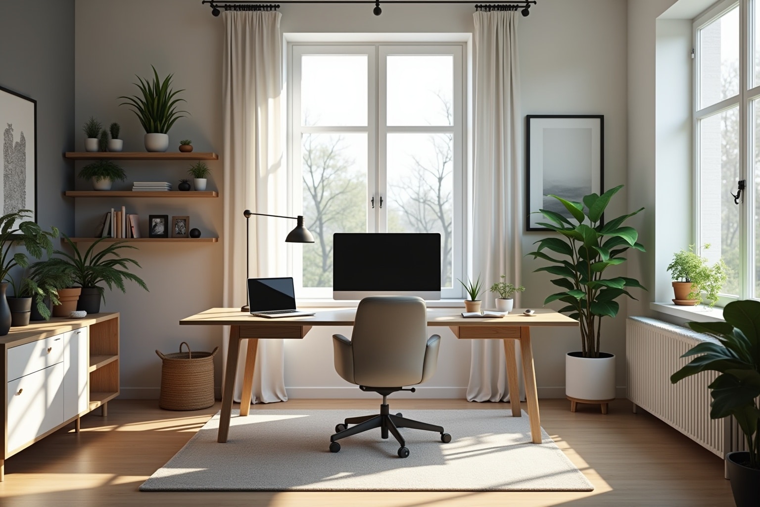 - Teppiche: Ein Teppich unter dem Schreibtisch kann den Bereich definieren und für Akustik sorgen.